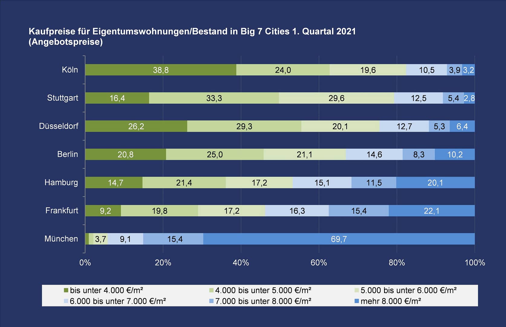 Das IVD-Marktforschungsinstitut analysierte das Preisniveau bei Eigentumswohnungen aus dem Bestand in den süddeutschen Landeshauptstädten München und Stuttgart im Vergleich der deutschen Immobilienmetropolen („Big 7“ genannt) im ersten Quartal 2021. Bei den Preisen handelt es sich um Angebotspreise.